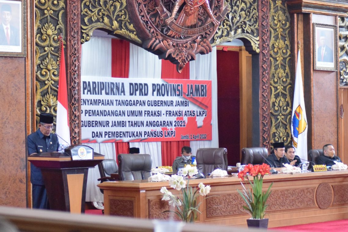 Gerak12.com- Dewan Perwakilan Rakyat Daerah Provinsi Jambi, Menggelar rapat paripurna dalam rangka penyampaian tanggapan pemerintah terhadap pemandangan umum fraksi-fraksi atas Nota Pengantar Laporan Keterangan Pertanggungjawaban (LKPj) Gubernur Jambi Tahun Anggaran 2021 dan Pembentukan Pansus LKPJ, Jumat (01/04/2022).