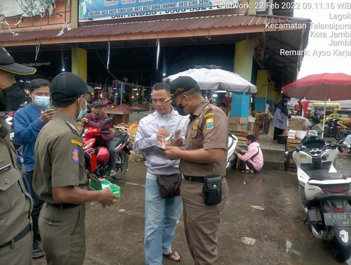 JAMBI – Satpol PP Provinsi Jambi menggelar razia protokol kesehatan di Pasar Angso Duo dan Pasar Sijinjang yang berada di Kota Jambi pada Selasa (22/2/22).